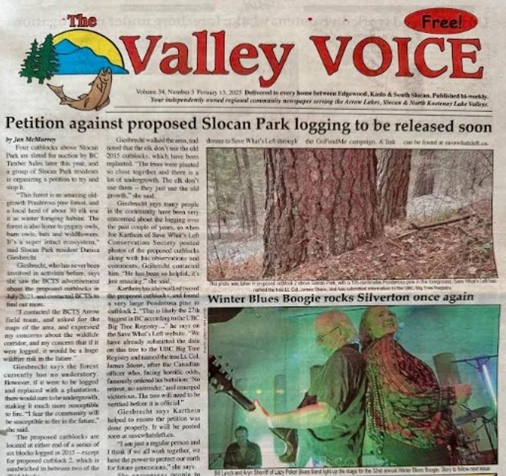 February 2025 Valley Voice article on Slocan Park BCTS Logging.